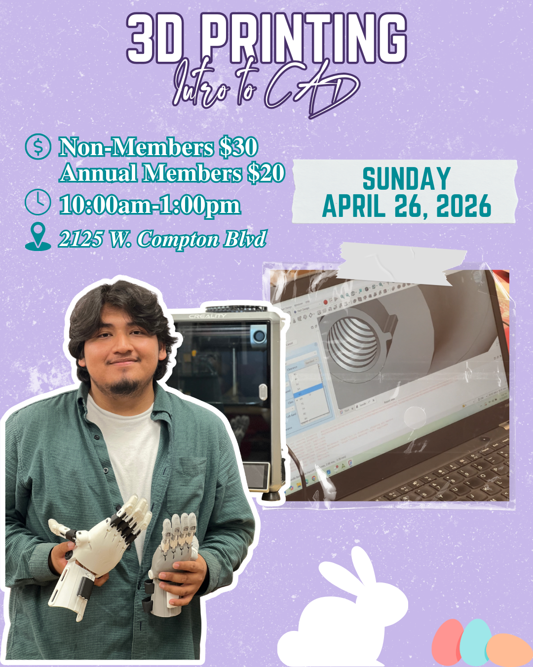 Learn to use free CAD software in our intro to CAD class. We will teach participants to use Computer-aided design software! We will teach you how to navigate free CAD software and utilize it to create your designs at home. We will also teach participants how to use supports and about appropriate filaments for your projects.