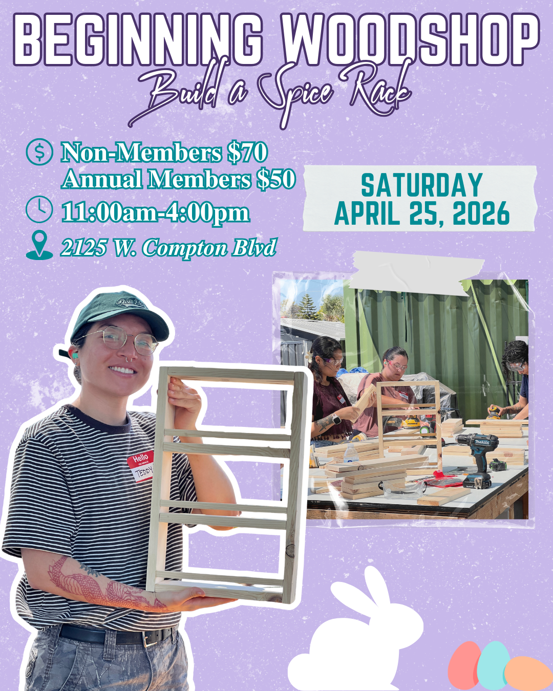 Make your own spice rack! Participants will learn about how to use pocket screws and utilize these techniques to create their own spice rack. They will also be taught how to safely handle and use a nail gun, miter saw, sander, and drill.