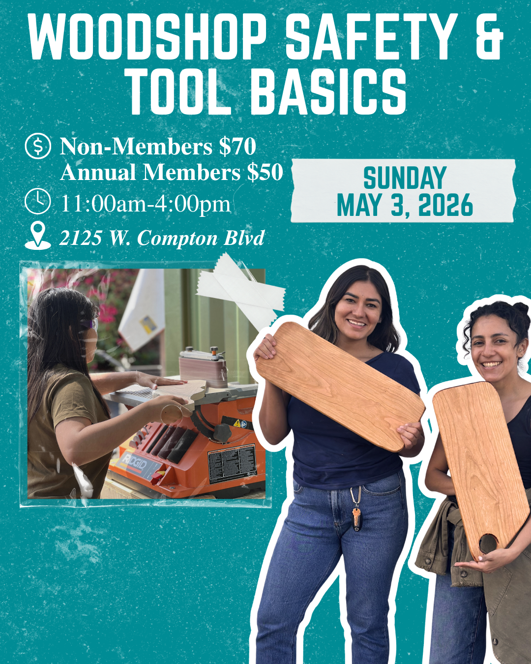 New to woodworking? Learn how to safely and confidently use woodworking tools, including a table saw, router, planer, drill press, and miter saw. Participants must wear closed-toe shoes, hair tied up, no loose jewelry. You will learn vital safety practices to keep you safe and handy! You will make a cutting or charcuterie board using all the tools! (Free to Compton Residents who qualify under CDBG Requirements)